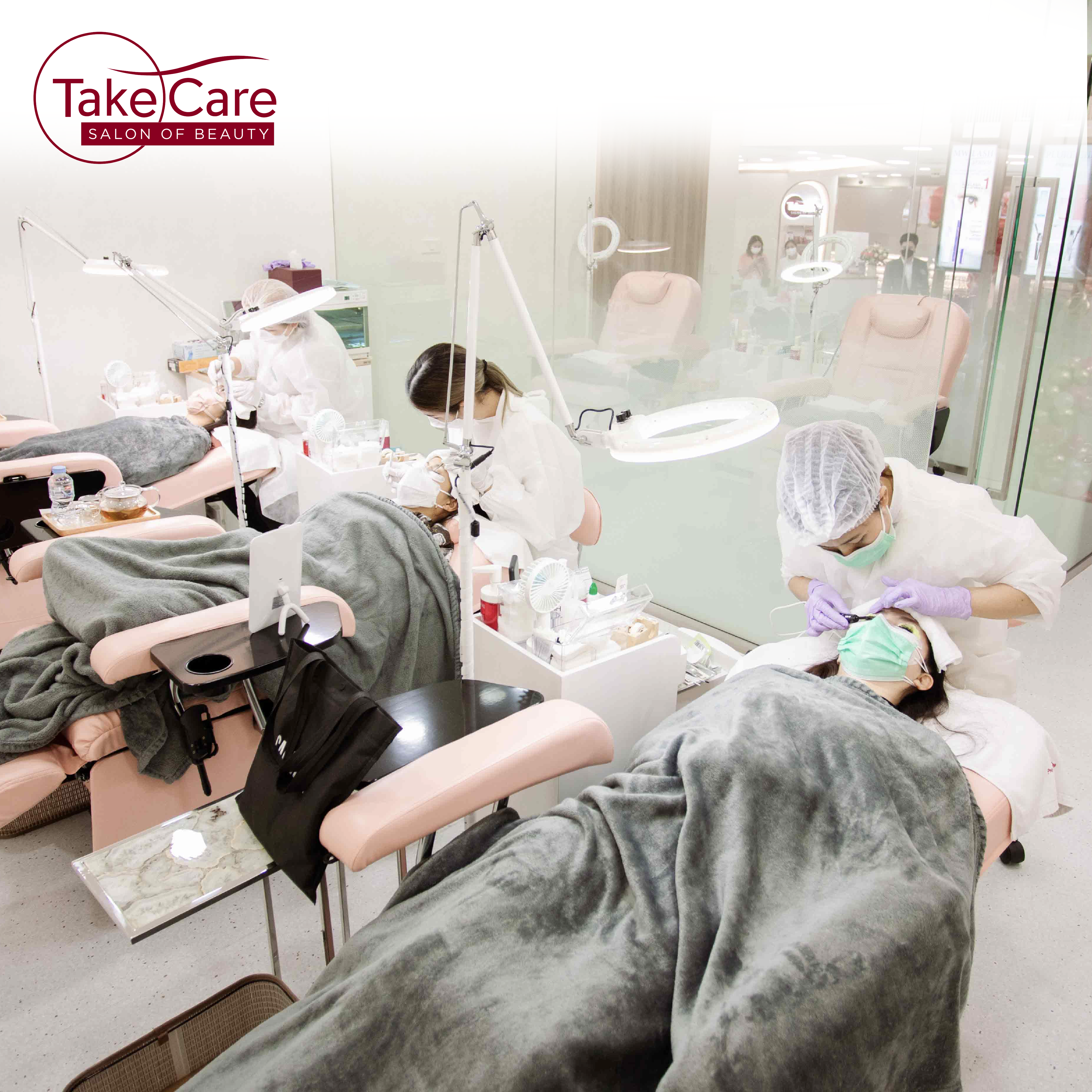 นี่เลยค่ะ Take Care Salon of Beauty เป็นร้านที่บุกเบิกให้บริการต่อขนตาเป็นเจ้าแรกๆ ในไทยจนทุกวันนี้เปิดมาเป็นเวลากว่า 27 ปีแล้ว ที่สำคัญมีสาขามากถึง 11 สาขาทั่วกรุงเทพฯ ตามจุด BTS ที่เดินทางสะดวกมากๆ คิดดูว่าถ้าไม่เจ๋ง ไม่ดีจริง คงอยู่มาไม่ได้จนถึงทุกวันนี้นะคะ ที่เทคแคร์เราเน้นในเรื่องของความสะอาดสุดๆ เพราะในการต่อขนตาแน่นอนว่าเป็นจุดที่ sensitive มาก เนื่องจากใกล้กับบริเวณดวงตา ทำให้ต้องระมัดระวังเป็นพิเศษค่ะ เครื่องมืออุปกรณ์ที่ใช้ก็ใช้แบบ 1 ชุดต่อ 1 ท่าน มีการทำความสะอาดฆ่าเชื้ออย่างดีมาตรฐานเดียวกับโรงพยาบาล แต่แค่ความสะอาดคงไม่พอถูกไหมคะ? เทคแคร์เรามีดีมากกว่านั้นในเรื่องของฝีมือประสบการณ์ความละเอียดต่างๆ ก็ไม่แพ้กันค่ะเราใส่ใจทุกขั้นตอน มีเทคนิคพิเศษเฉพาะ ที่แน่นอนว่าต่อออกมาแล้วได้ดั่งใจของคุณสาวๆ อย่างแน่นอน