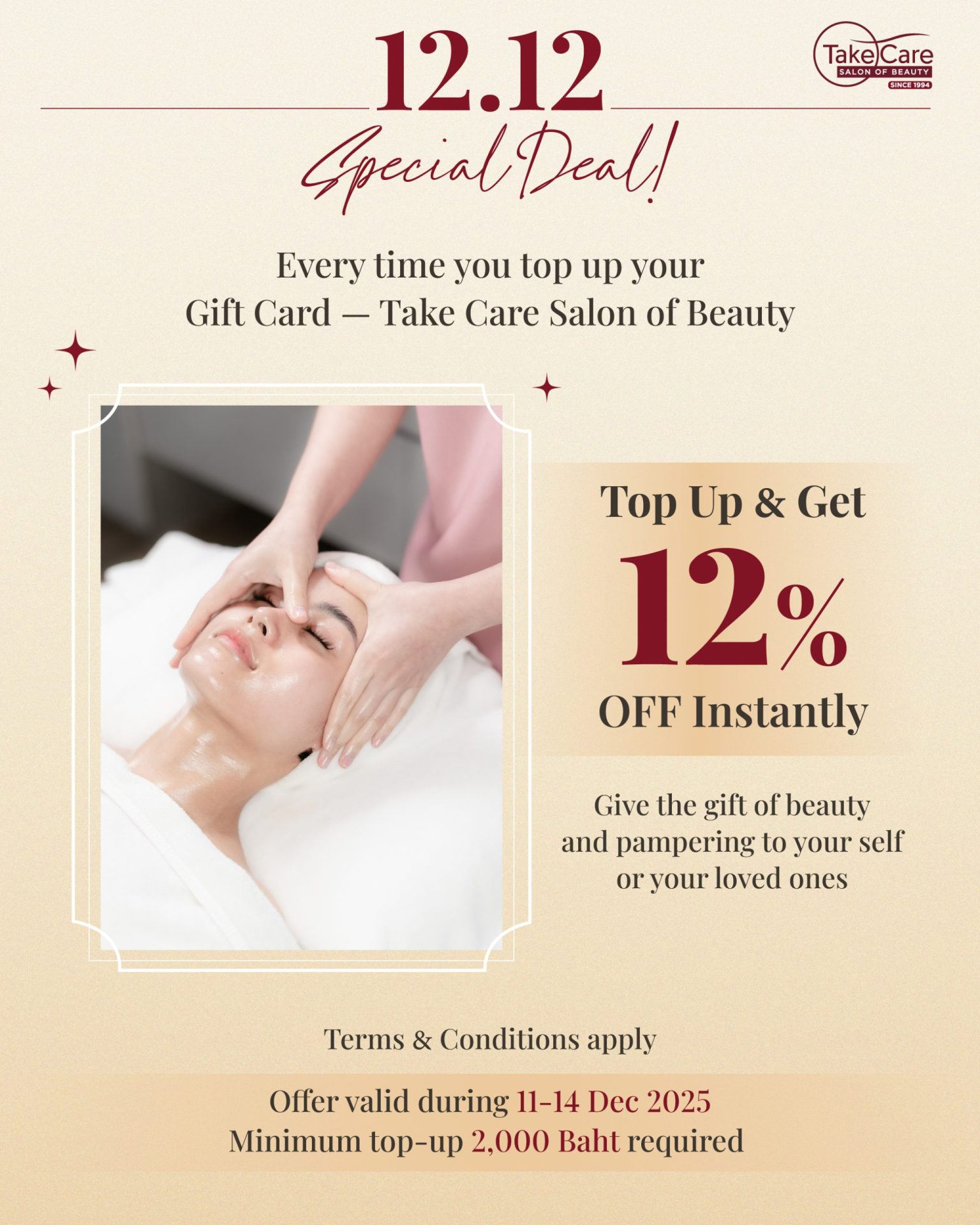 HAPPY HOUR สุดพิเศษ! ช่วงเวลาทองแห่งความสวย… รับ ส่วนลด 20% ทุกบริการ เฉพาะที่ Take Care Salon of Beauty สาขา Silom Complex เท่านั้น! 🕚 ทุกวัน เวลา 1